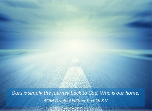 The journey to God is merely the reawakening of the knowledge of where you are always and what you are forever. It is a journey without distance to a goal that has never changed. ACIM OE TEXT CH 8 VI par 51